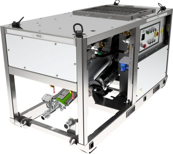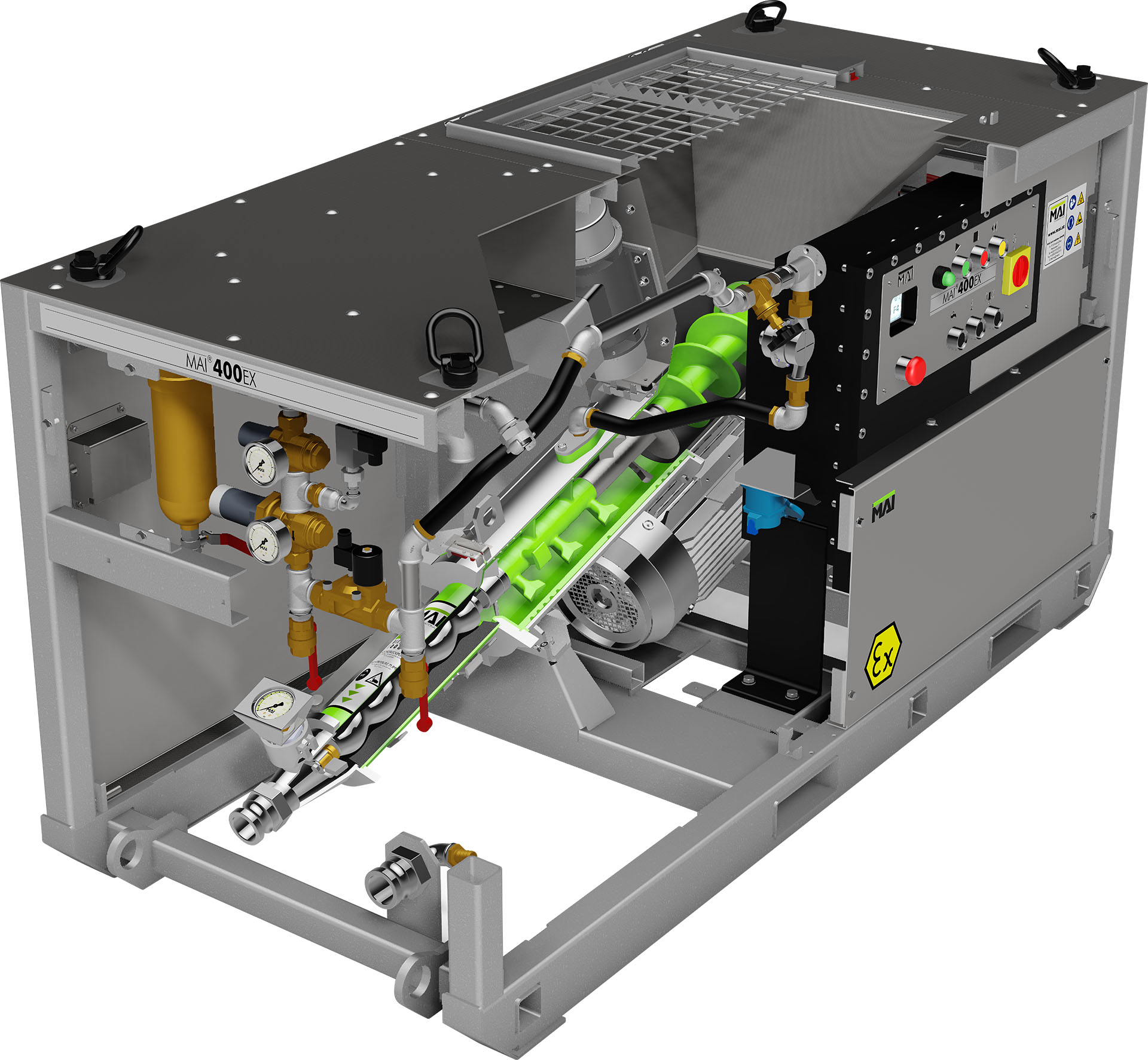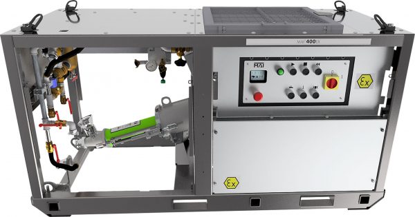 The skid-mounted mixing pump MAI®400EX for cementitious grout was specially designed for tough working environments often found in underground mining. This machine will continuously mix and pump the widest range of grouting materials from thin to thick consistencies. The rugged steel frame stands up to the toughest conditions on the job site. Operator controls are centrally located for efficient production. All components are easily accessible for operating, cleaning and maintenance.